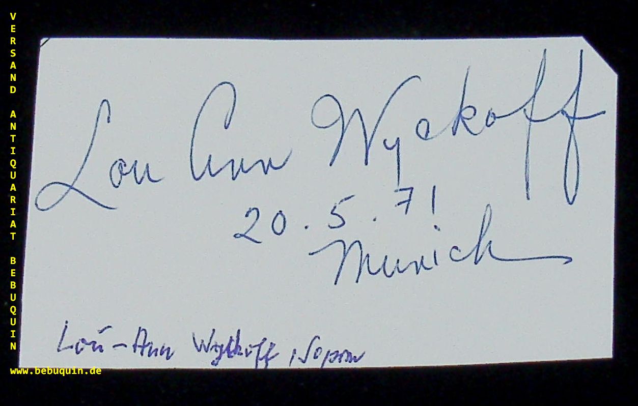 WYCKOFF, Lou Ann (Sopran): eigenhändig signiertes und datiertes Blatt. München, 20.5.1971. 5 x 9,5 cm. 1 Blatt. recht seltenes Autogramm. Wyckoff, Lou Ann (* 20. Juli 1937 Berkeley/Kalifornien, † 26. Dezember 2016 New York).