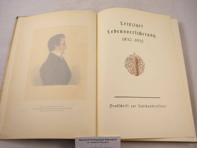 LEIPZIG.– WALTHER: Leipziger Lebensversicherung 1830 – 1930. Denkschrift zur Jahrhundertfeier. Leipzig (Reclam), 1930. Gr. 4°. 239 S. mit zahlr. Abb. sowie einem farb. Frontispiz+ 10 farb. Bildtafeln. OHLn mit Gold- und Blindprägung. feines Ex.