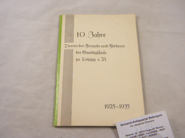 LEIPZIG.– RENNERT, Oskar: 10 Jahre Verein der Freunde und Förderer der Gaudigschule zu Leipzig e.V. 1925 – 1935. Leipzig (Hahn), 1935. Gr. 8°. 31 S. inliegend Umschlag mit 6 Origonalfotos der Schule. farb. ill. OPb. tadellos.