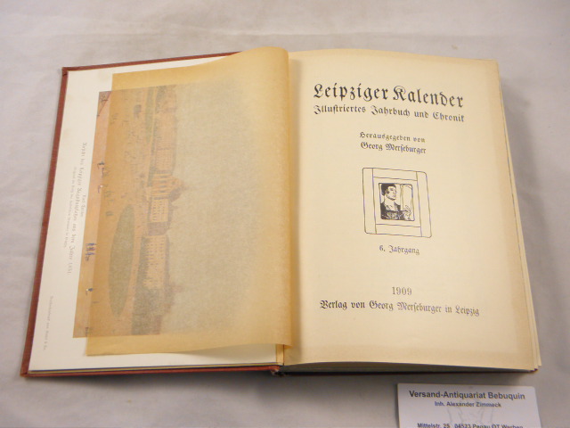 LEIPZIG.– MERSEBURGER, Georg: (Hrsg.) Leipziger Kalender. 06. Jg. Illustriertes Jahrbuch und Chronik. Leipzig (Merseburger), 1909. 288, 4, 110 S. mit zahlr. teils farb. Abb. + teils gefalteten Bildtafeln. ill. OLn. gut erhalten. EA.