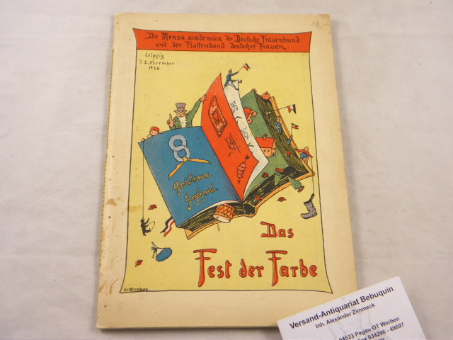 LEIPZIG.– FEST DER FARBE.– Programmheft der Goldenen Hochzeit von Dorothea Schröder und Hellmut Paul in Leipzig. Die Mensa academica der Deutsche Frauenbund und der Flottenbund deutscher Frauen. Leipzig , November 1926. Gr. 8°. 38 S. mit zahlr. Silhouetten in Originalgröße von Frau Marta Sachse-Schubert und farb. Bildern von H. Georgi von Sternburg. farb. ill. OKart von H. Georgi von Sternburg. Einband leicht angeschmutzt, sonst überraschend gut erhalten.