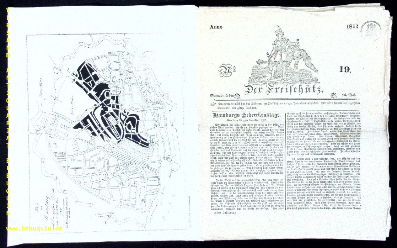 HAMBURG.– RÖHRS, H.H.: (Hrsg.) Der Freischütz Nr. 19. Hamburg (Gottfriedt), 4.5.1842. 4°. 4 Bl. mit Kopfvignette und beiliegendem Plan von Hamburg nach dem großen Brande. Die Brandstätte schwarz bezeichnet als Gratis Beilage zum Freischütz. OBr. Kanten leicht bestoßen, schönes Ex. Diese erste Ausgabe nach der Katastrophe enthält einen sechsseitigen Bericht über „Hamburgs Schreckenstage“. Mit dem Plan von allergrößter Seltenheit.