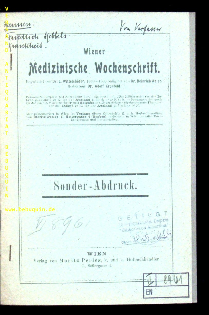 MEDIZIN.– HANSSEN: Friedrich Hebbels Krankheit. Zu des Diochters hundertstem Geburtstage. Wien (Perles), 1913. Gr. 8°. 10 S. OBr. in Kart der Zeit. Ordnungsgemäß ausgesondertes Bibliotheksexemplar (Rückenschild, Stempel). = Sonderabdruck aus der Wiener Medizinischen Wochenschrift. EA mit einer eigenhändigen Verfasserzueignung auf Umschlag.