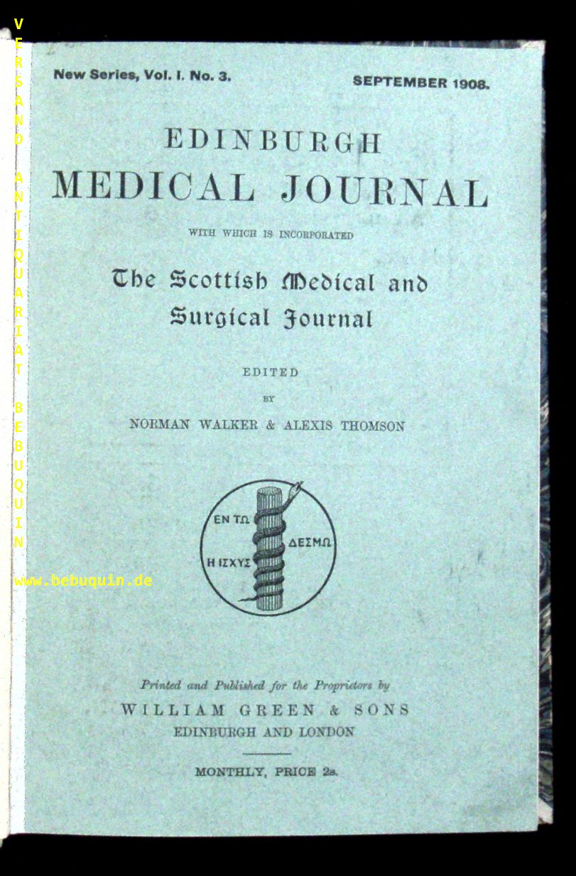 MEDIZIN.– EDINBURGH MEDICAL JOURNAL.– Vol. I. No 3. Hrsg. von Norman Walker + Alexis Thomson. Edinburgh (Green), 1908. Gr. 8°. S. 192- 288 mit zahlr. Abb. + Bildtafeln sowie XXII, 6 S. Werbeanhang. OKart. in Pb der Zeit. Ordnungsgemäß ausgesondertes Bibliotheksexemplar (Rückenschild, Stempel). EA mit interessanten Artikeln von Sir Alexander Russell Simpson, James H. Nicol, H.A. Lediard, Frank Crombie u.v.a.