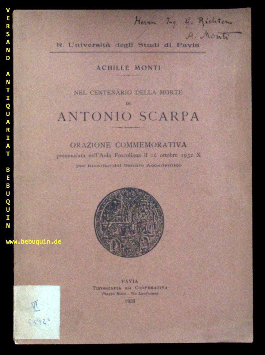 MEDIZIN.– MONTI, Achille: Nel Centenario della Morte di Antonio Scarpa. Orazione Com memorativa pronunziata nell’Aula Foscoliana il 16. octobre 1932. Pavia (Botta), 1933. Gr. 8°. 50 S. + 8 Bildtafeln. OKart. Ordnungsgemäß ausgesondertes Bibliotheksexemplar (Rückenschild, Stempel). EA mit einer eigenhändigen signierten Verfasserwidmung auf Umschlag..