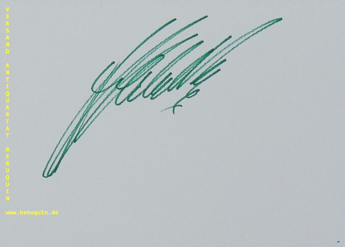 KARAJAN, Herbert von (Dirigent): eigenhändig mit grünem Stift signiertes Autogrammblatt. Berlin, 5.3.1973. 10,5 x 14,5 cm. große Karteikarte. tadellos. Herbert von Karajan (* 5. April 1908 in Salzburg; † 16. Juli 1989 in Anif, Salzburg; geboren als Heribert Ritter von Karajan, in Österreich ab 1919 amtlich Heribert Karajan) war ein österreichischer Dirigent. Als solcher zählt er zu den bekanntesten und bedeutendsten des 20. Jahrhunderts. Karajan arbeitete mit vielen angesehenen Symphonieorchestern, wirkte an bedeutenden Opernhäusern und veröffentlichte zahlreiche Einspielungen klassischer Musik. (Wikipedia)