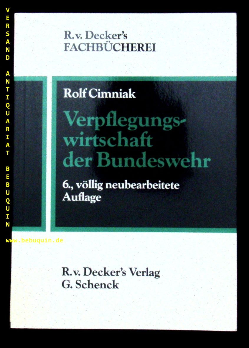 CIMNIAK, Rolf: Verpflegungswirtschaft der Bundeswehr. 6. neubearb. Aufl. Heidelberg (Decker’s), 1989. XXV, 382 S. OKart. Ordnungsgemäß aus Bundeswehrbeständen ausgesondertes Bibliotheksexemplar (Rückenschild, Stempel). selten.