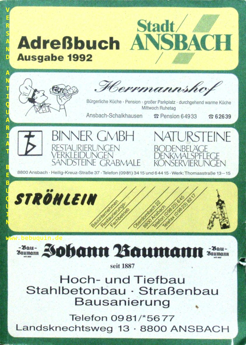 ANSBACH.– STADTADRESSBUCH ANSBACH 1992.– Bearb. nach amtlichen Unterlagen der Stadtverwaltung und nach eigenen Erhebungen. 4. Ausgabe. Fellbach (Novoprint), 1992. 8, 64, 208, 48, 156 S. farb. ill. OKart. eine Ecke leicht bestoßen, sonst gut erhalten.