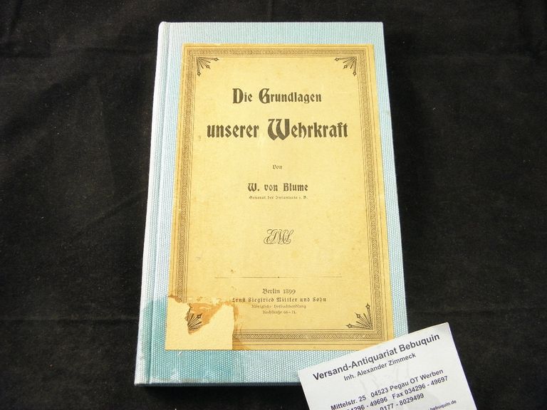 BLUME, W. von: Die Grundlagen unserer Wehrkraft. Berlin (Mittler), 1899. Gr. 8°. 177 S. neues Ln mit aufgesetztem ODeckel. Ordnungsgemäß aus Bundeswehrbeständen ausgesondertes Bibliotheksexemplar (Stempel). EA.