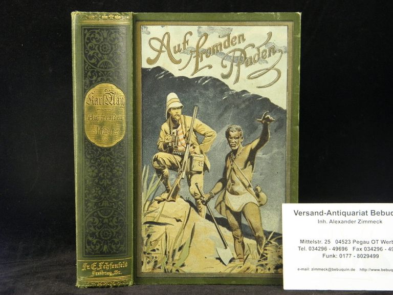 MAY, Karl: Auf fremden Pfaden. Reiseerzählungen. 31.– 35. Tsd. Freiburg (Fehsenfeld), (1907). 598 (1) S. ill. OLn. (DB 74). gering schief gelesen, feiner farbstarker Einband, Rückenschild nur leicht geblichen, insgesamt schönes Ex.. = Gesammelte Werke, Bd. 23. Seltene letzte Auflage bei Fehsenfeld. Plaul 294.6.
