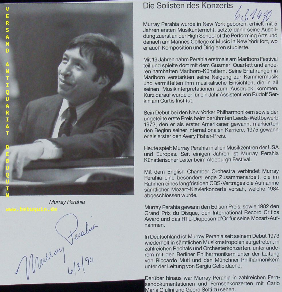PERAHIA, Murray (Pianist, Dirigent): eigenhändig signierte und datierte Portraitseite. München, 6.3.1990. 17,5 x 16,5 cm. 1 Bl. Murray Perahia (* 19. April 1947 in New York) ist ein US-amerikanischer Pianist und Dirigent. (Wikipedia)