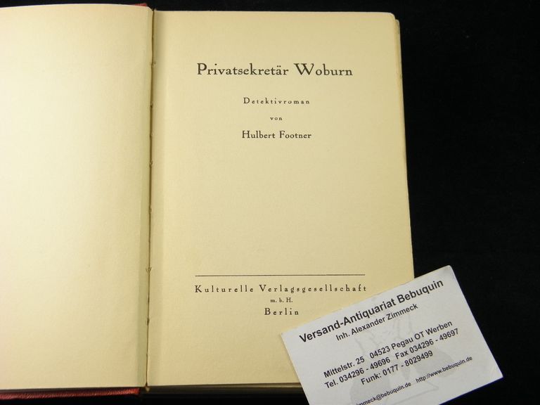 FOOTNER, Hulbert: Privatsekretär Woburn. Detektivroman. D.v. Hans Herdegen. Berlin (Kulturelle), (1935). 272 S. OPb in Lederoptik. feines Ex. = Iris Silber Reihe. die tatsächliche dt. EA. (Schädel 2400)