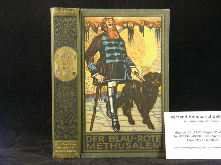 MAY, Karl: Der blaurote Methusalem. Eine lustige Studentenfahrt nach China. 83.– 94. Tsd. Volksausgabe. Radebeul (Karl May), (1928). 569 (2) S. farb. ill. OHLn. (DB 76d) Kapital gering gedrückt, insgesamt schönes Ex. mit goldglänzendem Rücken. = Gesammelte Werke, Bd. 40.