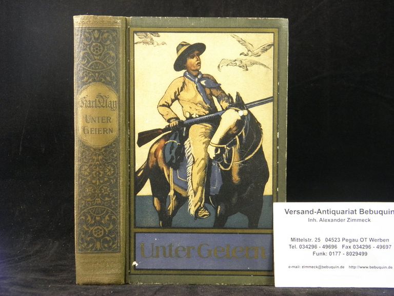 MAY, Karl: Unter Geiern. 91.– 102. Tsd. Erzählung aus dem wilden Westen. Volksausgabe. Radebeul (Karl May), (1927). 633 (2) S. farb. ill. OHLn. farbstarkes Ex., WaV., etwas schiefgelesen und gelockert. = Gesammelte Werke, Bd. 35. letzte Auflage vor den Lizenzauusgaben. Hermesmeier / Schmatz GW 35.15.