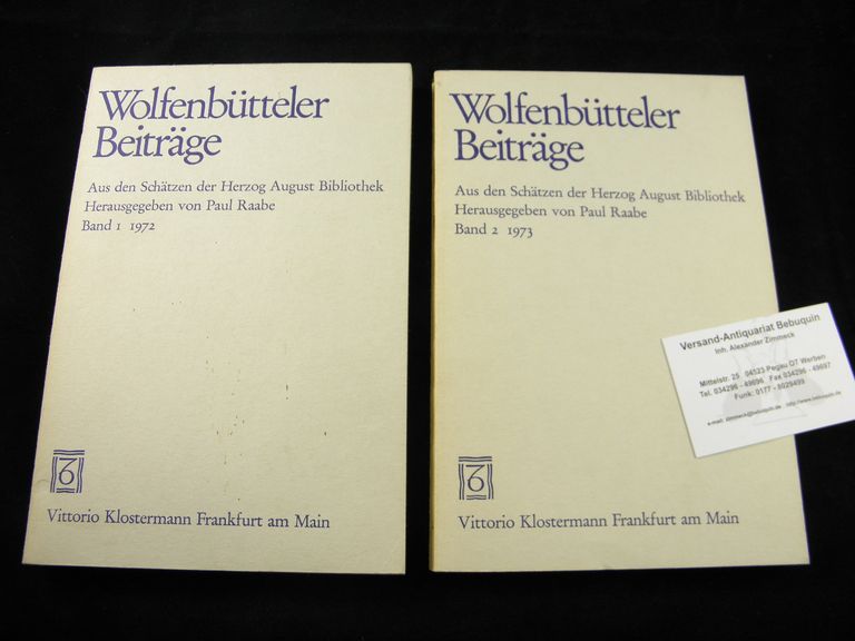 RAABE, Paul: (Hrsg.) Wolfenbütteler Beiträge. Aus den Schätzen der Herzog August Bibliothek. Bd. 1 + 2. 2 Bände. Frankfurt (Klostermann), 1972/73. Gr. 8°. 263 S. + 11 Bildtafeln sowie 191 S. + 15 Bildtafeln OKart. EA.