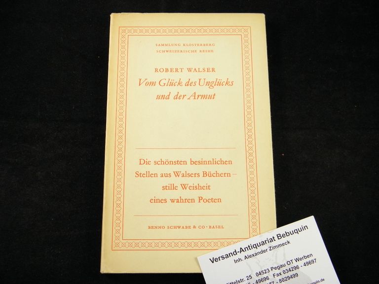 WALSER, Robert: Vom Glück des Unglücks und der Armut. Hrsg. von Carl Seelig. Basel (Schwabe), 1944. 80 S. mit Radierungen von Charles Hug. OPb. mit OUmschl. = Sammlung Klosterberg, Schweizerisceh Reihe. EA WG² 20.
