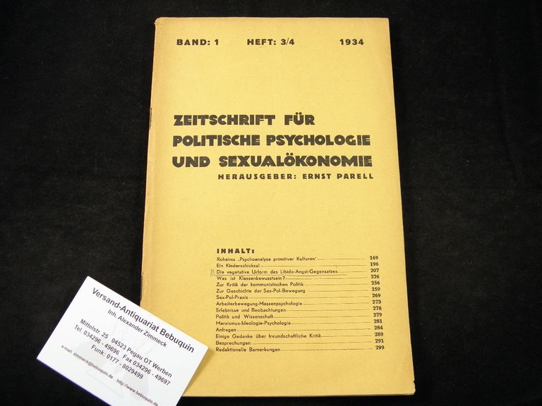 Seltene Originalausgabe. Enthält die Beiträge Reichs: Roheims „psychoanalyse primitiver Kulturen“, Die vegetative Urform des Libido-Angst-gegensatzes etc. Das Organ der von ihm gegründeten Sex-Pol-Bewegung wurde von Reich, der sich zeitweilig illegal in Dänemark aufhielt, nachdem sein schwedisches Visa nicht verlängert wurde, unter dem Pseudonym Parell herausgegeben.