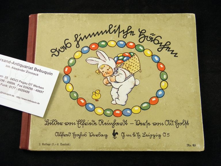 REINHARDT.– HOLST, Adolf: Das himmlische Häschen. 2. Aufl. Leipzig (Hahn), ca 1925. Quer 8°. 14 starke Kartonblätter mit farb. Bildern von Elfriede Reinhardt. farb. ill. OHLn. Einband etwas fingerspurig, erste Seite mit Knickspur, sonst von guter Erhaltung. sehr seltene frühe Ausgabe Klotz 2869/42 kennt nur die Hamburger Ausgabe.
