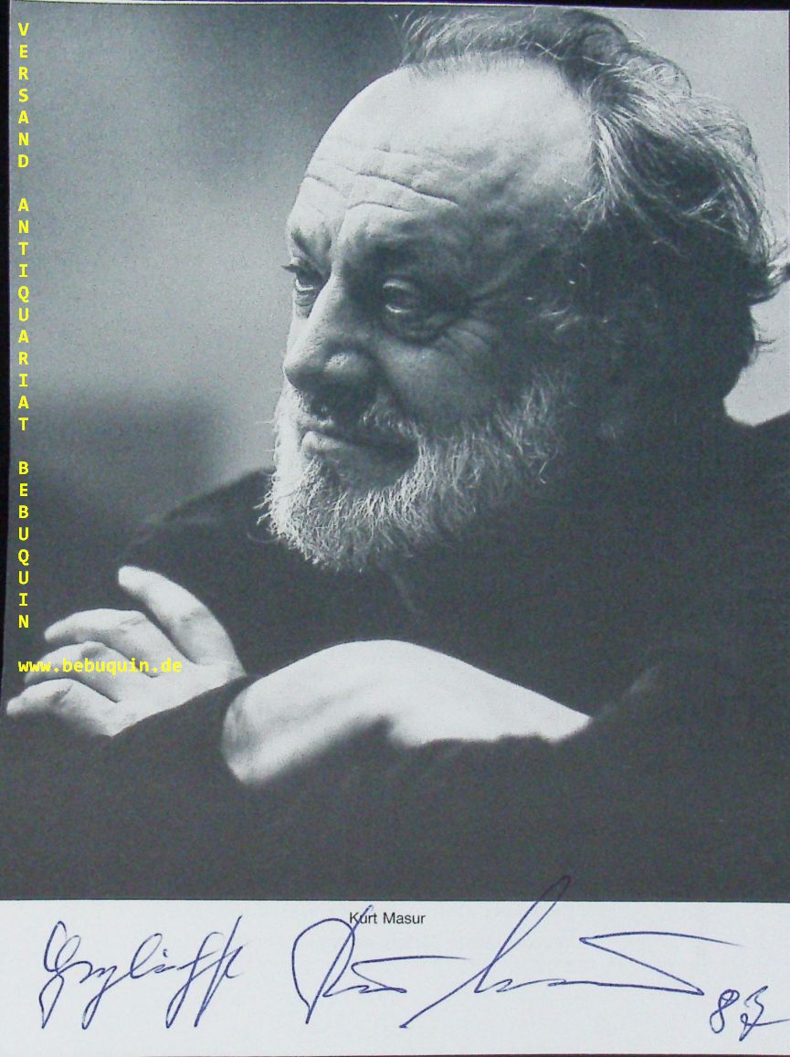 MASUR, Kurt (Dirigent): eigenhändig signierte und datierte Portraitseite. München (Herkulessaal), 1987. 19 x 14 cm. 1 Bl. Kurt Masur (* 18. Juli 1927 in Brieg, Niederschlesien; † 19. Dezember 2015 in Greenwich, Connecticut) war ein deutscher Dirigent. Er war von 1970 bis 1996 Gewandhauskapellmeister in Leipzig, von 1991 bis 2002 Musikdirektor der New Yorker Philharmoniker und von 2000 bis 2007 Chefdirigent des London Philharmonic Orchestra. (Wikipedia)