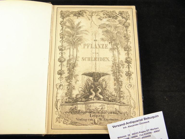 BOTANIK.– SCHLEIDEN, M.J.: Die Pflanze und ihr Leben. Populäre Beiträge. 5. verbesserte Aufl. Leipzig (Engelmann), 1858. Gr. 8°. XIV, 396 S. Mit 1 chromolith. Frontispiz nach de Heem, 5 farb. Kupfertafeln und 14 Holzschnitt-Tafeln gezeichnet von Wilh. Georgy und von J. G. Flegel in Holz geschnitten sowie Textholzschnitten. HLdr der Zeit mit goldgeprägtem Rücken und mit eingebundenen ill. ODeckel von 1857. teilweise etwas stockfleckig, mit allen Pergamentschutzblätter.