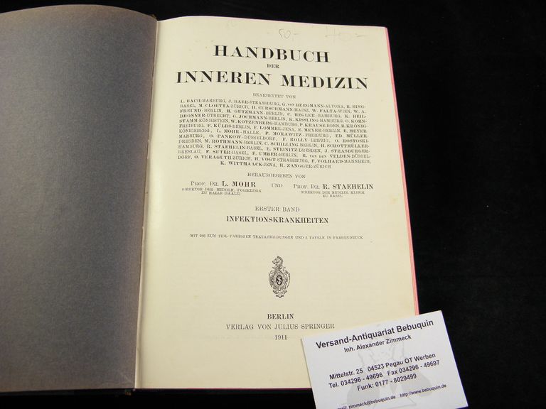 MEDIZIN.– MOHR, L. + STAEHELIN, R.: Handbuch der inneren Medizin. Bd. I: Infektionskrankheiten. Berlin (Springer), 1911. Gr. 8°. XV, 1077 (11) S. mit 288 teils farb Textabb. + 3 Farbtafeln. HLdr. der Zeit mit goldgeprägtem Rücken. Kanten etwas berieben, sonst von guter Erhaltung. EA des Standardwerks.