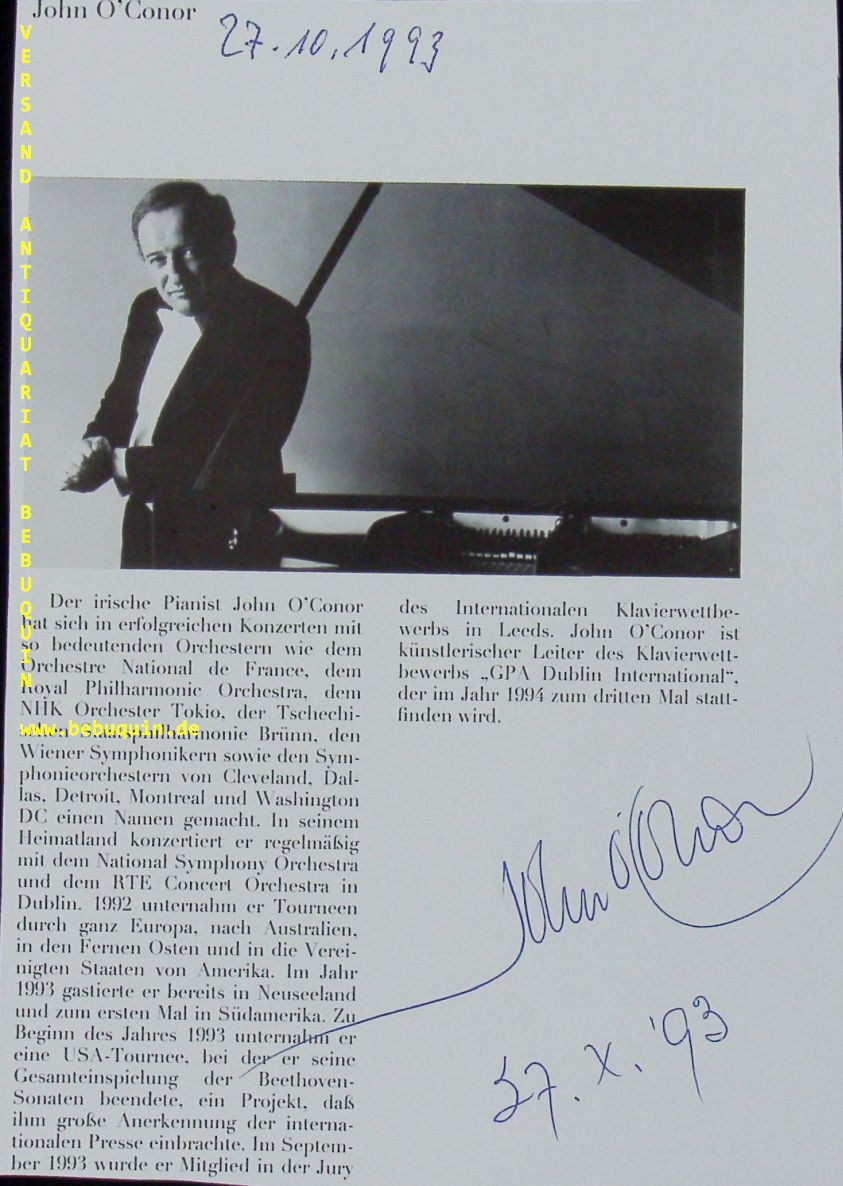 O’CONOR, John (Pianist): eigenhändig signierte und datierte Portraitseite. München (Philharmonie), 27.10.1993. 20 x 14 cm. 1 Bl. John O’Conor (* 18. Januar 1947 in Dublin) ist ein irischer Pianist und Klavierpädagoge. Bis 2010 war er Direktor der Royal Irish Academy of Music. (Wikipedia)