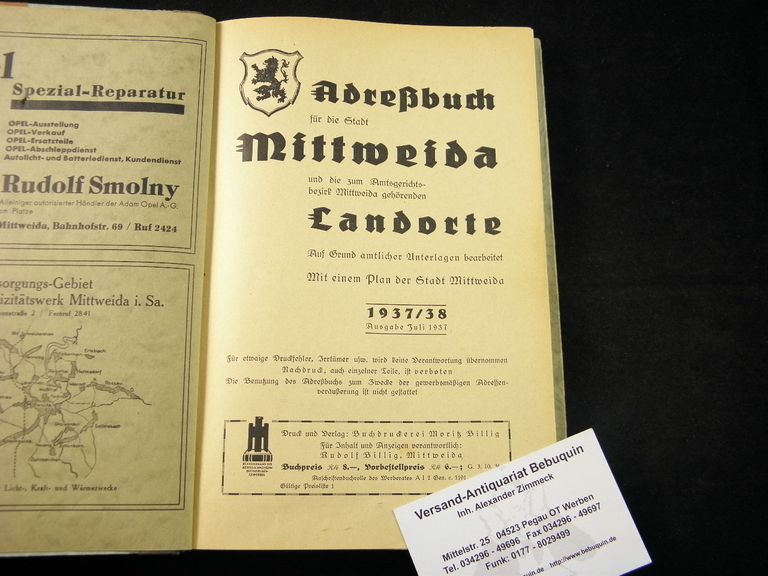 MITWEIDA.– ADRESSBUCH FÜR DIE STADT MITTWEIDA 1937/38.– Und die zum Amtsgerichtsbezirk Mittweida gehörenden Landorte. Auf Grund amtlicher Unterlagen bearb. Mittweida (Billig), 1937. Gr. 8°. VIII, 134, 78, 78 S. ill. OHln. mit neuem Rücken. eine Ecke mit kleiner Tesareparatur, der Stadtplan fehlt. sehr seltenes Adressbuch.