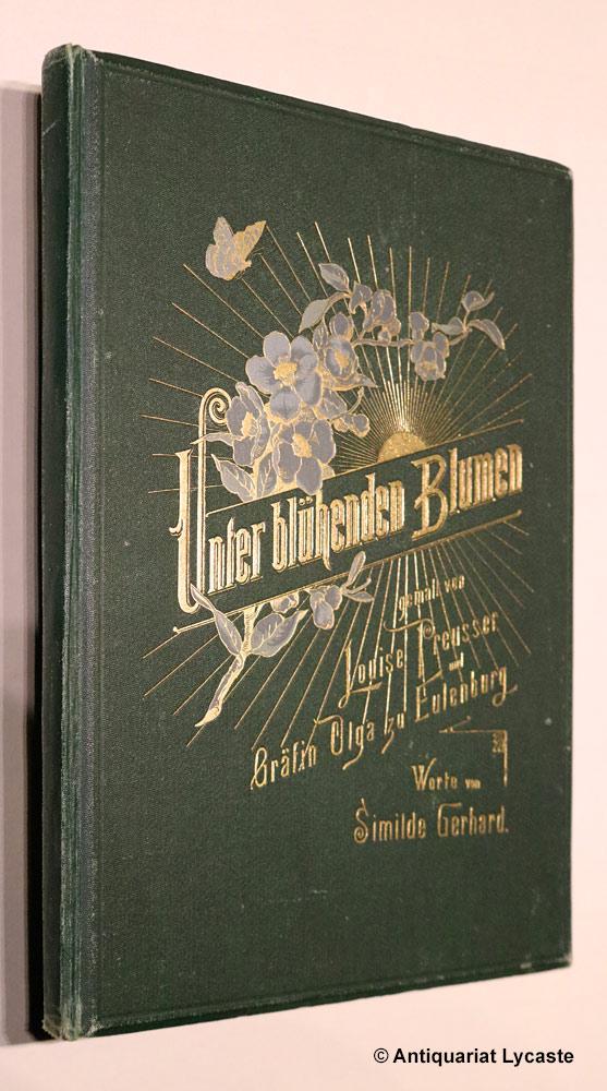 BOTANIK.– GERHARD, Similde: Unter blühenden Bäumen. Leipzig (Meissner), (1886). 4°. 34 Bl. mit 64 farb. und 4 schwarzweißen Bildtafeln von Louise Preusser und Olga zu Eulenburg. farb. ill. OHLn. Gelenke stabilisiert, sonst sehr feines Ex. Seltene EA. Zweiundfünfzig Pflanzenarten werden auf jeweils 1 – 2 Seiten dargestellt: ganzseitige Tafel oder kleinere Abbildung mit romantisierendem Beiwerk und poetischen Gedichten. Pflanzennamen in Deutsch, Lateinisch, Englisch, Französisch.