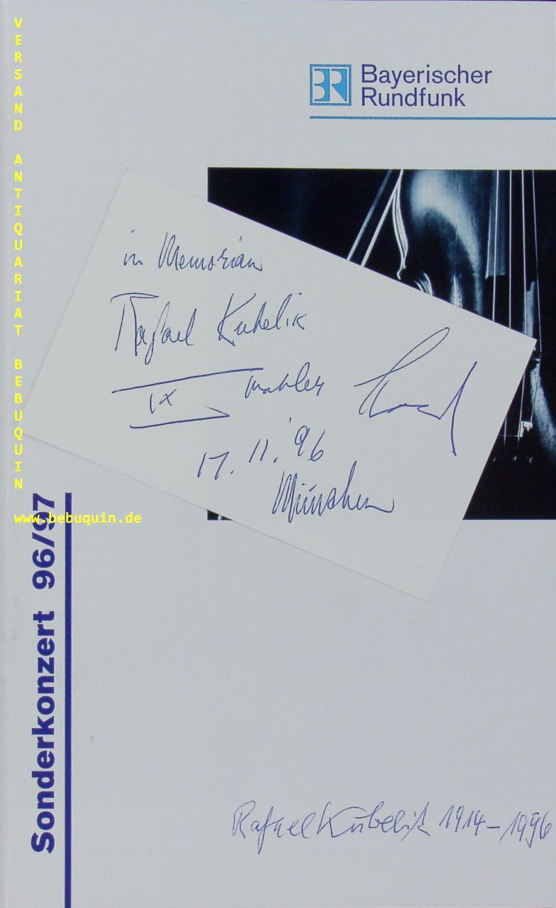 MAAZEL, Lorin (Dirigent) + RITZKOWSKY, Johannes (Hornist): eigenhändig datierte und signierte Autogrammkarten: in Memorian Rafael Kubelik (1914 – 1996). Mit dem Symphonieorchester des BR. München (Herkulessaal), 17.11.1996. 8 x12,5 cm. Karteikarten in Programmheft zum Sonderkonzert 1996/97.. 36 S. mit zahl. Abb. OKart. seltenes Zeitdokument. Lorin Varencove Maazel (* 6. März 1930 in Neuilly-sur-Seine, Frankreich; † 13. Juli 2014 in Castleton, Rappahannock County, Virginia) war ein US-amerikanischer Dirigent, Violinist und Komponist.