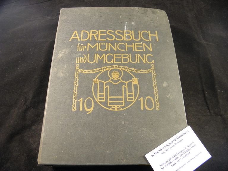 MÜNCHEN.– ADRESSBUCH FÜR MÜNCHEN UND UMGEBUNG 1910.– Hrsg. von der Kgl. Polizeidirektion hierzu das Handels- und Gewerbeadressbuch hergestellt nach dem Stande vom November 1909. München (Huber), 1909. 4°. 698, 596, 275, 322, 57 S. mit zahlr. Abb, dem Plan vom Hauptbahnhof München, Ergebnis der Volkszählung 1905 etc. und der Umgebungskarte inliegend ill. OLn. Einband bestaubt, innen etwas gebräunt, jedoch insgesamt von überraschend guter Eerhaltung. Es fehlt der Stadtplan. Sehr seltenes Adressbuch.