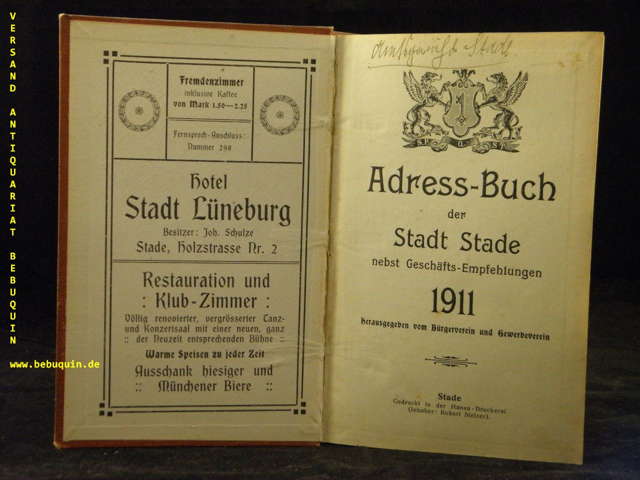 STADE.– ADRESSBUCH DER STADT STADE 1911.– nebst Geschäftsempfehlungen. Hrsg. vom Bürgerverein und Gewerbeverein. Stade (Stelzer), 1911. kl. 8°. 244 S. + 40 S. Werbeanhang. OLn. NaT. sehr seltenes Adressbuch.