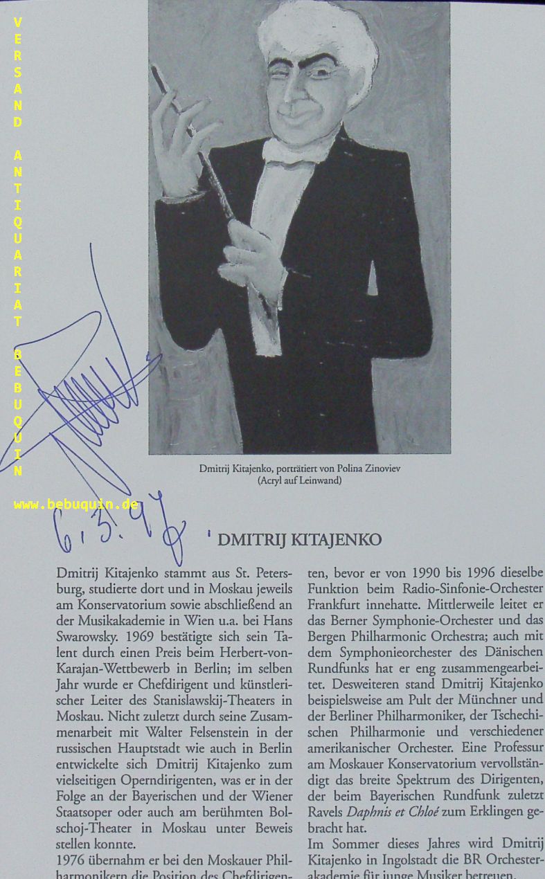 KITAJENKO, Dmitrij (Dirigent): eigenhändig signierte Portraitseite mit Gemäldeportrait. München (Philharmonie), 6.3.1997. 23,5 x 14,5 cm. 1 Bl. Dmitri Georgijewitsch Kitajenko (* 18. August 1940 in Leningrad (heute Sankt Petersburg), Sowjetunion) ist ein russischer Dirigent. (Wikipedia)