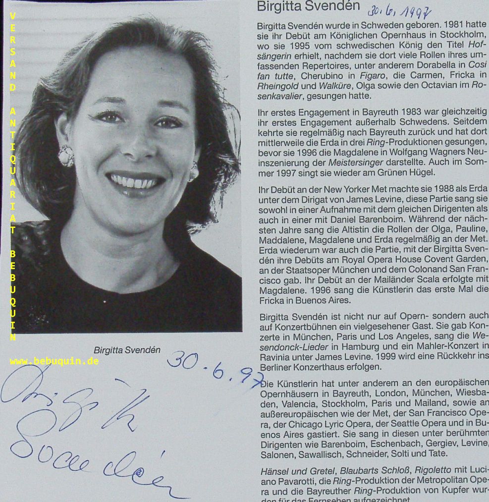 SVENDEN, Brigitta (Mezzosopran): eigenhändig signierte und datierte Portraitseite. München (Philharmonie), 30.6.1997. 17,5 x 17 cm. 1 Bl. Birgitta Svendén (née Lundberg, 20 March 1952), is a Swedish operatic mezzo-soprano. (Wikipedia)