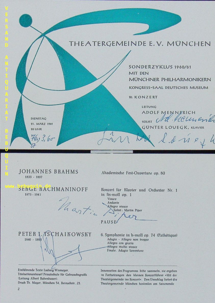MAAG, Peter (Dirigent) + PIPER, Martin (Pianist): eigenhändig von beiden signierter Programmzettel der Theatergemeinde. München 20.3.1962. 11 x 15 cm. 1 Blatt + ein weiterer signierter Programmzettel der Theatergemeinde. Ernst Peter Johannes Maag (* 10. Mai 1919 in St. Gallen; † 16. April 2001 in Verona) war ein Schweizer Dirigent. (Wikipedia)
