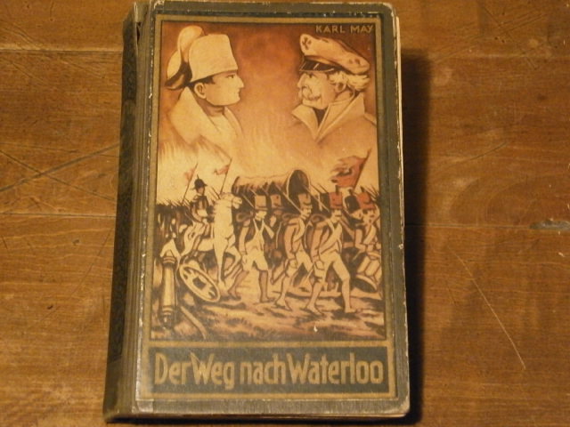 MAY, Karl: Der Weg nach Waterloo. Roman. Hrsg. von E.A. Schmid und Franz Kandolf. Volksausgabe. Radebeul (Karl May), ca 1925. 471 (1) S. farb. ill. OHLn. Rücken geblichen, schief gelesen, Kap gering angeplatzt, vorderes Gelenk gelockert. = Gesammelte Werke, Bd. 56. Von der Volksausgabe dieser EA wurden nur halb so viele Exemplare gedruckt wie von der Leinenausgabe. Hermesmeier GW56.1P.