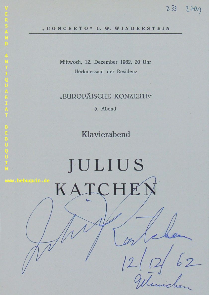KATCHEN, Julius (Pianist): eigenhändig signierte Programmseite. München (Herkulessaal), 12.12.1962. 20 x 15 cm. 1 Faltblatt. = Euroäische Konzerte / 5. Abend. Julius Katchen (* 15. August 1926 in Long Branch, New Jersey; † 29. April 1969 in Paris) war ein US-amerikanischer Pianist russisch-jüdischer Abstammung. Katchens Repertoire war zwar zunächst breit, konzentrierte sich jedoch ab Ende der 1950er Jahre immer mehr auf die Werke von Johannes Brahms. Er nahm so auf Schallplatte dessen gesamtes Soloklavierwerk auf (eine bis heute in ihrer Kraft, Virtuosität und Werkdurchdringung maßstabsetzende Aufnahme). Am 11. Dezember 1968 nahm er am „Rock ‚n‘ Roll Circus“ der Rolling Stones teil. (Wikipedia)