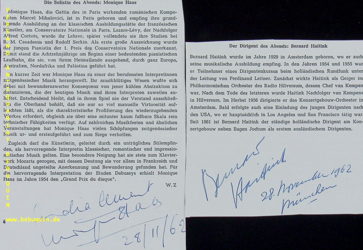 HAITINK, Bernard (Dirigent) + HAAS, Monique (Pianistin): 2 eigenhändig signierte und datierte Programmblätter. München (Philharmonie), 28.11.1962.. 3 Bl. Bernard Johan Herman Haitink (* 4. März 1929 in Amsterdam) ist ein niederländischer Dirigent. Monique Haas (* 20. Oktober 1909 in Paris; † 9. Juni 1987 ebenda) war eine französische Pianistin. (Wikipedia)