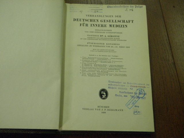 MEDIZIN.– VERHANDLUNGEN DER DEUTSCHEN GESELLSCHAFT FÜR INNERE MEDIZIN.– Hrsg. von A. Géronne. 50. Kongress. München (Bergmann), 1938. Gr. 8°. LXXI, 583 S. mit 236 Abb und 38 Tabellen im Text. HLn der Zeit mit goldgeprägtem Rücken. Ordnungsgemäß aus den Beständen der Volkspolizei ausgesondertes Bibliotheksexemplar (Rückenschild, Stempel). EA.