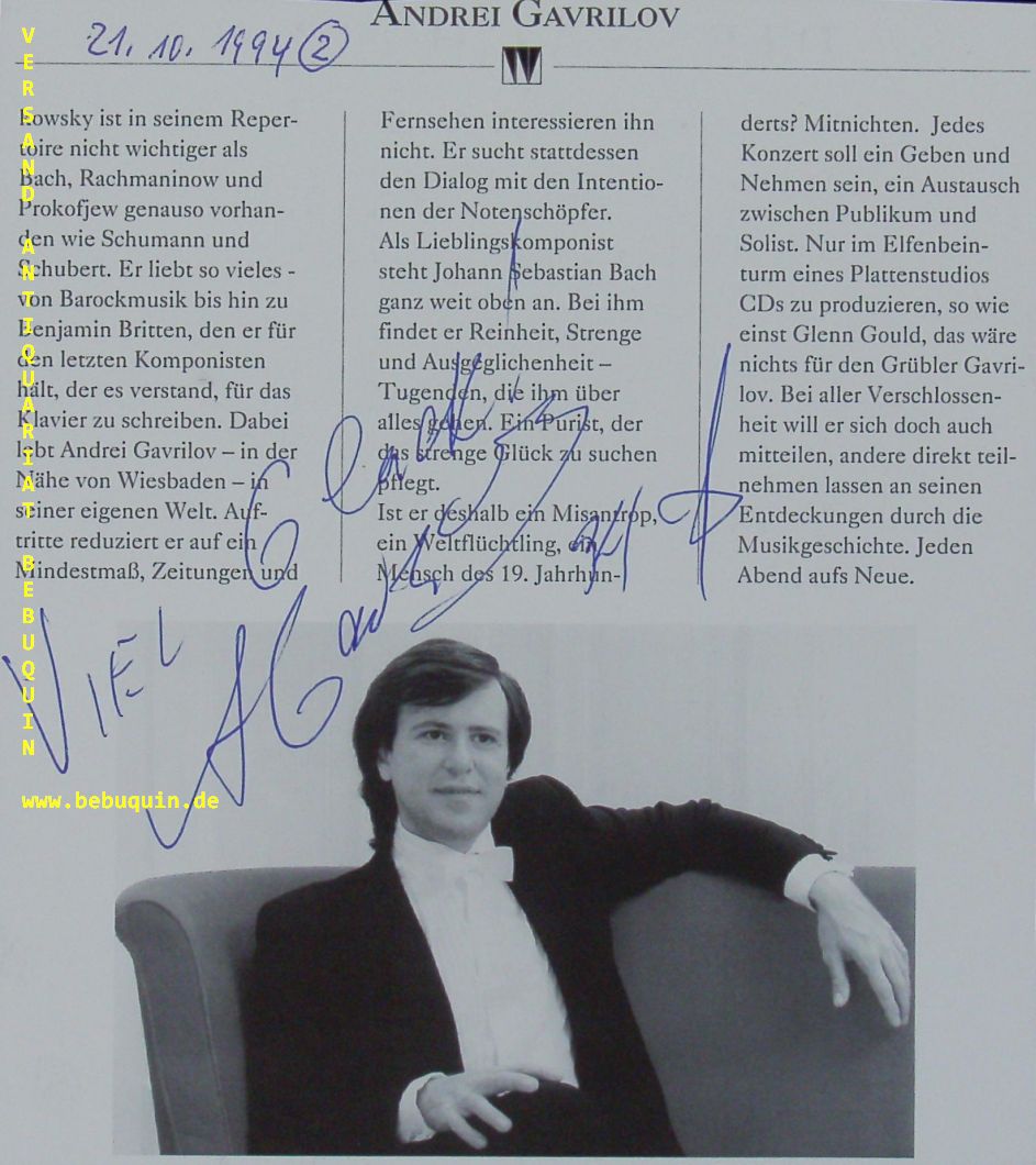 GAVRILOV, Andrei (Pianist): eigenhändig datierte und signierte Portraitseite: Viel Glück!. München (Philharmonie), 21.10.1994. 18 x 16 cm. 1 Bl. Andrei Wladimirowitsch Gawrilow (* 21. September 1955 in Moskau) ist ein russischer Pianist. Nach dem Gewinn des Tschaikowski-Wettbewerbs 1974 wurde Gawrilows internationale Karriere zweimal abrupt unterbrochen: 1979 bis 1984 wurde er vom Sowjet-Regime in die Isolation gezwungen, 1993 bis 2001 zog er sich aufgrund einer Lebenskrise vollkommen zurück. Seit 2001 lebt Gawrilow in der Schweiz und setzt dort seine Karriere fort.