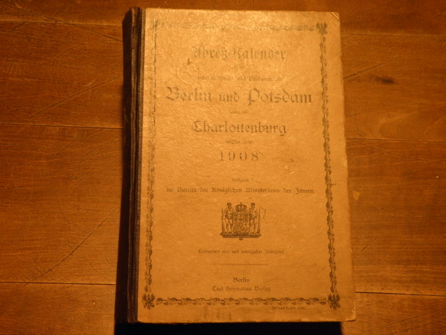 POTSDAM.– ADRESS-KALENDER FÜR DIE KÖNIGL. HAUPT- UND RESIDENZSTÄDTE BERLIN UND POTSDAM SOWIE FÜR CHARLOTTENBURG AUF DAS JAHR 1908.– Redigiert im Bureau des Königlichen Ministeriums des Innern. Berlin (Heymann), 1908. XL, 932 S. ill. OHLn. Vorsatz mit kleinem Einriss, sonst von guter Erhaltung.