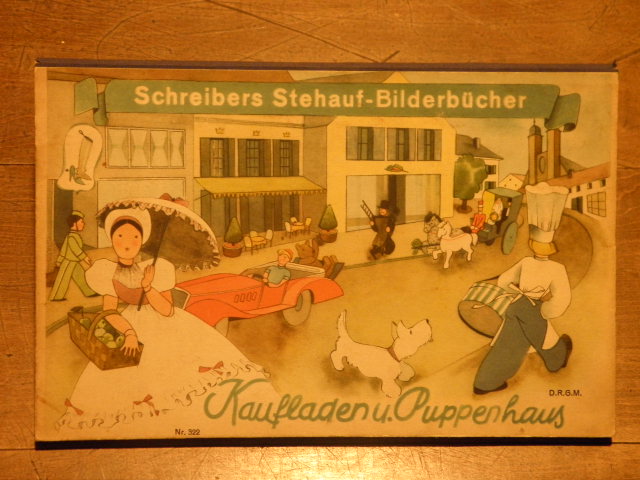 SCHREIBERS STEHAUF-BILDERBÜCHER.– FECHNER, Ellen: Kaufladen u. Puppenhaus. Eßlingen (Schreiber), (1937). Quer Gr. 8°. 4 farb. Klapppanoramen mit Aufstellfunktion gezeichnet von Edith Heise. farb. ill. OHLn. zwei kleine Abnrisse, sonst gut erhalten. = Nr. 322. EA.