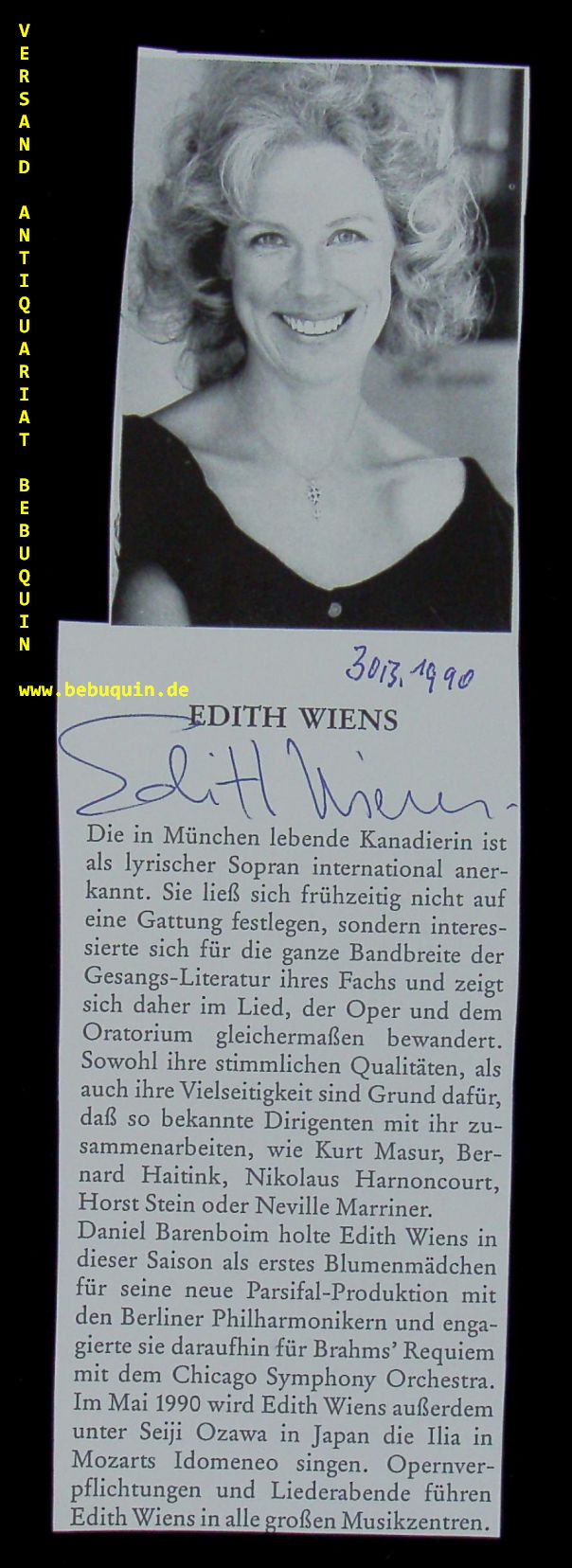 WIENS, Edith (Sopran): eigenhändig signierte Portraitseite. München (Philharmonie), 30.3.1990. 22 x 7 cm. 1 Bl. Edith Wiens (* 9. Juni 1950 in Saskatoon, Saskatchewan) ist eine kanadische Opern-, Lied- und Konzertsängerin (Sopran). (Wikipedia)