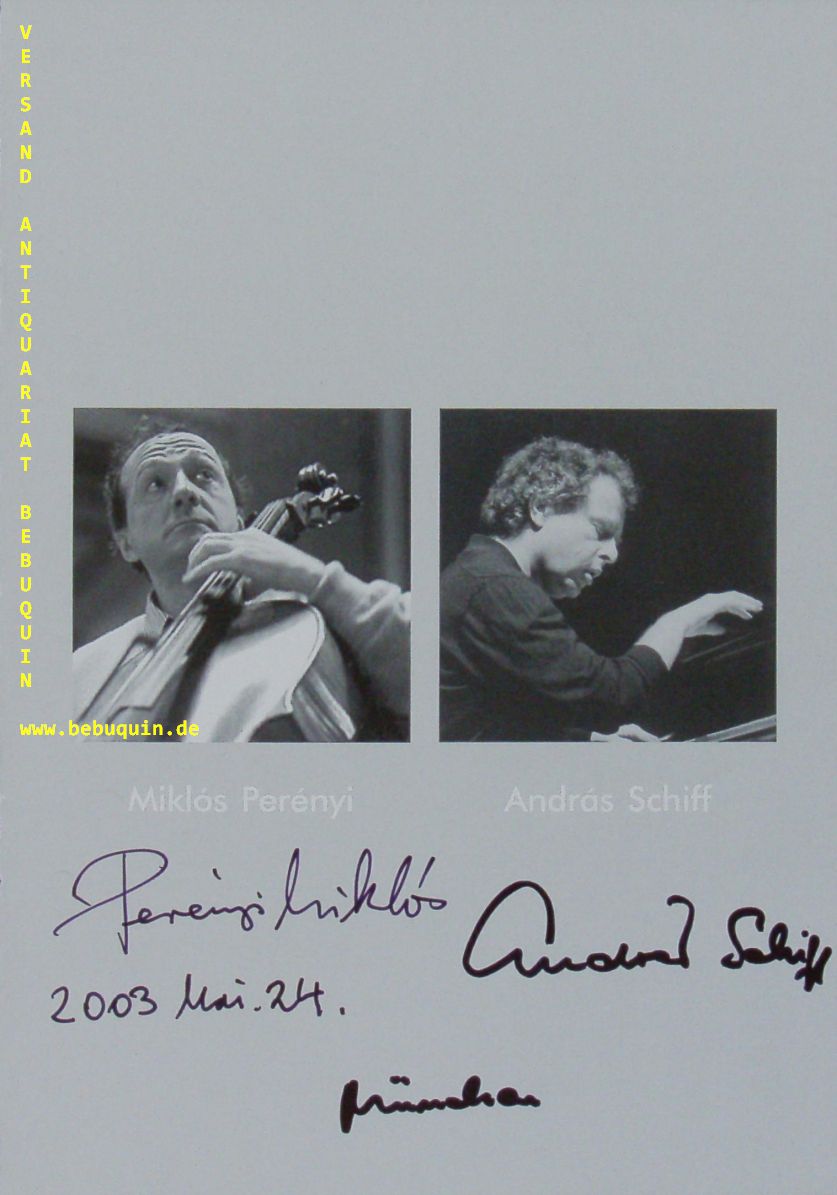 PERENYI, Miklos (Cellist) + SCHIFF, Andras (Pianist, Dirigent): eigenhändig von beiden signierte und datierte Portraits. München (Herkulessaal), 24.5.2003. 21 x 14,5 cm. 1 Bl. Miklós Perényi (* 5. Januar 1948 in Budapest) ist ein ungarischer Cellist. Sir András Schiff (* 21. Dezember 1953 in Budapest) ist ein ungarischer Pianist, Dirigent und Musikpädagoge, der auch die österreichische und britische Staatsbürgerschaft besitzt. (Wikipedia)