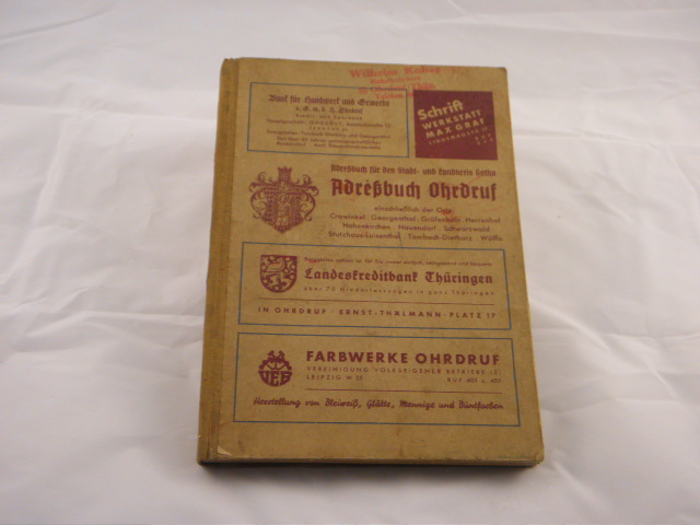 OHRDRUF.– ADRESSBUCH OHRDRUF / THÜR. 1950.– Für den Stadt- und Landkreis Gotha. Einschl. der Orte: Crawinkel, Georgenthal, Gräfenhain, Herrenhof, Hohenkirchen, Nauendorf, Schwarzwald, Stutzhaus mit Luisenthal, Tambsch, Wölfis. Gotha (Reyher), 1950. Gr. 8°. 143 S. ill. OHLn. Einband bestaubt, NaU, kaum gelockert. sehr seltenes 1. Nachkriegsadressbuch der Region.