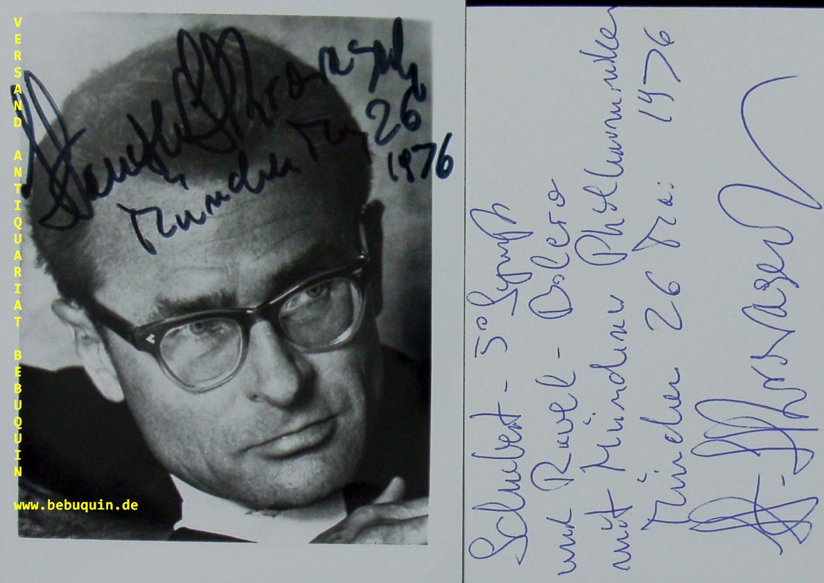 SKROWACZEWSKJI, Stanislaw (Dirigent): eigenhändig signierte und datierte Autogrammkarte + eigenhändig signiertes und datiertes Portraitfoto. München (Herkulessaal), 16.12.1989. 8 x 12,5 cm. 2 Bl. Stanislaw Pawel Stefan Jan Sebastian Skrowaczewski (* 3. Oktober 1923 in Lwów; † 21. Februar 2017 in St. Louis Park, Minnesota) war ein polnischer Dirigent und Komponist. (Wikipedia)