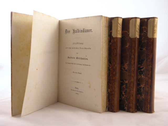MÖLLHAUSEN, Balduin: Der Halbindianer. Erzählung aus dem westlichen Nord-Amerika. 4 Bände. Leipzig (Costenoble), 1861 1118 S. HLdr der Zeit mit Papierrückenschildchen. teils leicht stockig, sonst sehr schönes Ex. sehr seltene EA. WG 3, Kosch X, 1192. Sabin 49911. Wagner-Camp 377a. – Erste Ausgabe seiner sehr frühen Abenteuererzählung.