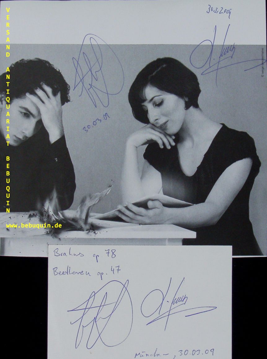 KHACHATRYAN, Sergej (Violinist) + Lusine (Pianistin): eigenhändig von beiden signierte und datierte Autogrammkarte und von beiden signierte und datierte Portraitseite. München (Herkulessaal), 30.3.2006. 8 x 12,5 + 19 x 19,5 cm. Karteikarte + 1 Bl. Sergei Chatschatrjan (* 5. April 1985 in Jerewan) ist ein armenischer Violinist. Lusine Khachatryan kreiert 2012 eine einzigartige Kunstform „Das Klaviertheater“, in der sie zwei Künste; die Schauspielkunst und die klassische Klaviermusik miteinander verbindet. Dabei erklingt die Musik in einer theatralischen Welt, und bekommt dadurch eine ganz andere, neuartige Dimension und Intensität.. (Wikipedia)