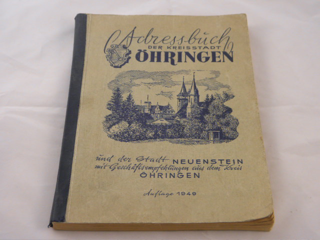 ÖHRINGEN.– ADRESSBUCH DER KREISSTADT ÖHRINGEN 1949.– Und der Stadt Neuenstein mit Geschäftsempfehlungen aus dem Kreis Öhringen. Öhringen, 1949. Gr. 8°. 136 S. ill. OHLn. Eine Seite mit Rostspuren von Büroklammer, sonst gut erhalten. sehr sehr selten