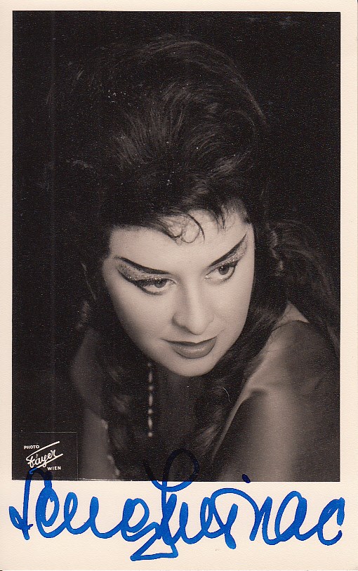 OPER.– JURINAC, Sena: eigenhändige Unterschrift auf Original Foto. Wien (Fayer). o.J. 13 x 9 cm. S/W. Sena Jurinac (eigentlich: Srebrenka Klementina Kristina Jurinac seit 1965 Sena Jurinac-Lederle * 24. Oktober 1921 in Travnik; † 22. November 2011 in Hainhofen) war eine jugoslawisch-österreichische Opernsängerin in den Stimmlagen Mezzosopran und Sopran. Sena Jurinac wurde 1921 als Tochter eines jugoslawischen Regimentsarztes und einer Wienerin geboren. Nach Absolvierung des Gymnasiums studierte sie Gesang bei Marija Kostrencic am Musikkonservatorium in Zagreb. Im Mai 1942 debütierte sie (in serbokroatischer Sprache) am Nationaltheater Zagreb, als Mimi in Puccinis La Bohème. Sie wurde von Karl Böhm an die Wiener Staatsoper engagiert, deren Mitglied sie bis 1982 war. Ihr Wiener Debüt am 1. Mai 1945 fand aber in der Wiener Volksoper statt, welche als Ausweichquartier für die ausgebombte Staatsoper diente. Jurinac wurde bald als eines der Mitglieder des Wiener Mozart-Ensembles bekannt. 1951 wurde sie zur Kammersängerin ernannt, vom Wiener Publikum „die Sena“ tituliert. (Wikipedia)