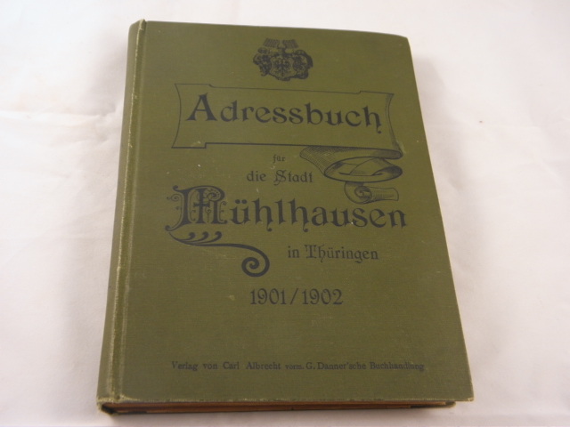 MÜHLHAUSEN.– ADRESSBUCH FÜR DIE STADT MÜHLHAUSEN IN THÜRINGEN 1901/1902.– Zusammengestellt auf Grund amtlicher Unterlagen. Mühlhausen (Albrecht), 1901. Gr. 8°. VIII, 220, 34 mit zahlr. Bildern und der farb. Faltkarte von Mühlhausen.. ill. OLn. Block etwas gelockert, insgesamt aber gut erhalten. Seltene Ausgabe.